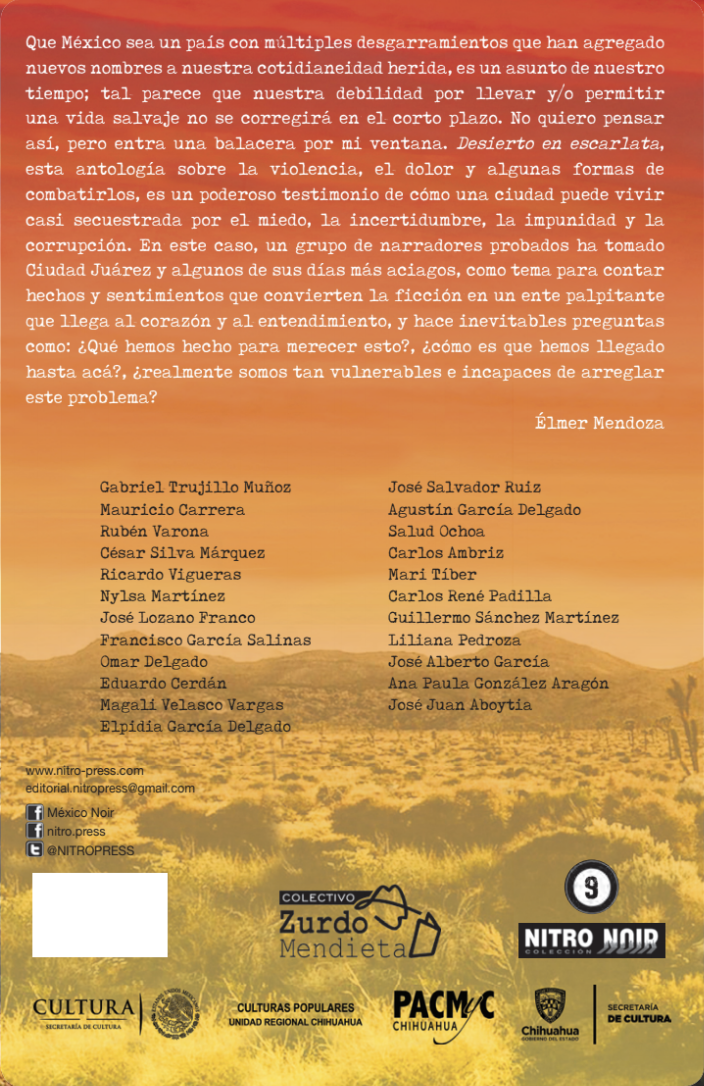 Nitropress acaba de editar Desierto en Escarlata, cuentos criminales de Ciudad Juárez. Aquí la portada y la contraportada. Incluye prólogo de Élmer Mendoza.