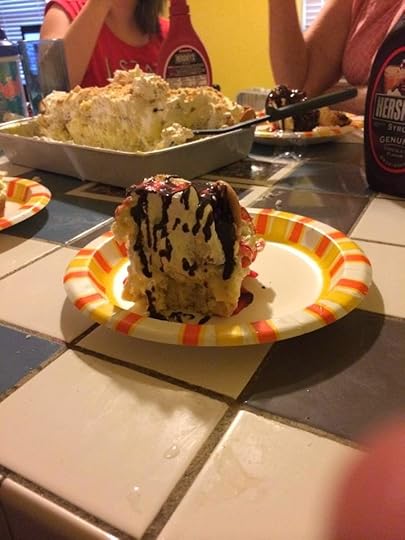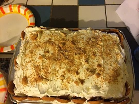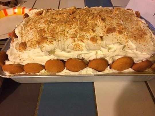 So today is Spouse's birthday. He wanted a loaded banana pudding cake, so he got it, with the pudding, fresh bananas, the cook whip, Vanilla wafers, and his choice of chocolate and/or syrup. Now, I've never liked banana pudding before, but this cake...