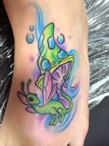 This weekend, Mike fixed up a tattoo on my foot. It had been just a lonely, odd looking alien dragonfly all faded and blah on my foot. Now it's this: