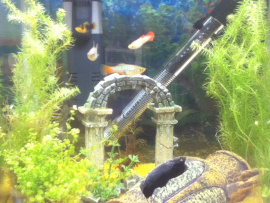 So we bought a tank for – What? It costs HOW MUCH?! And then there’s the filter and the heater and the gravel and the plants and the ornaments – gotta have ornaments, right? And then we let it cycle for a week before having the water checked and being officially allowed to take some guppies home. Very pretty they were too.