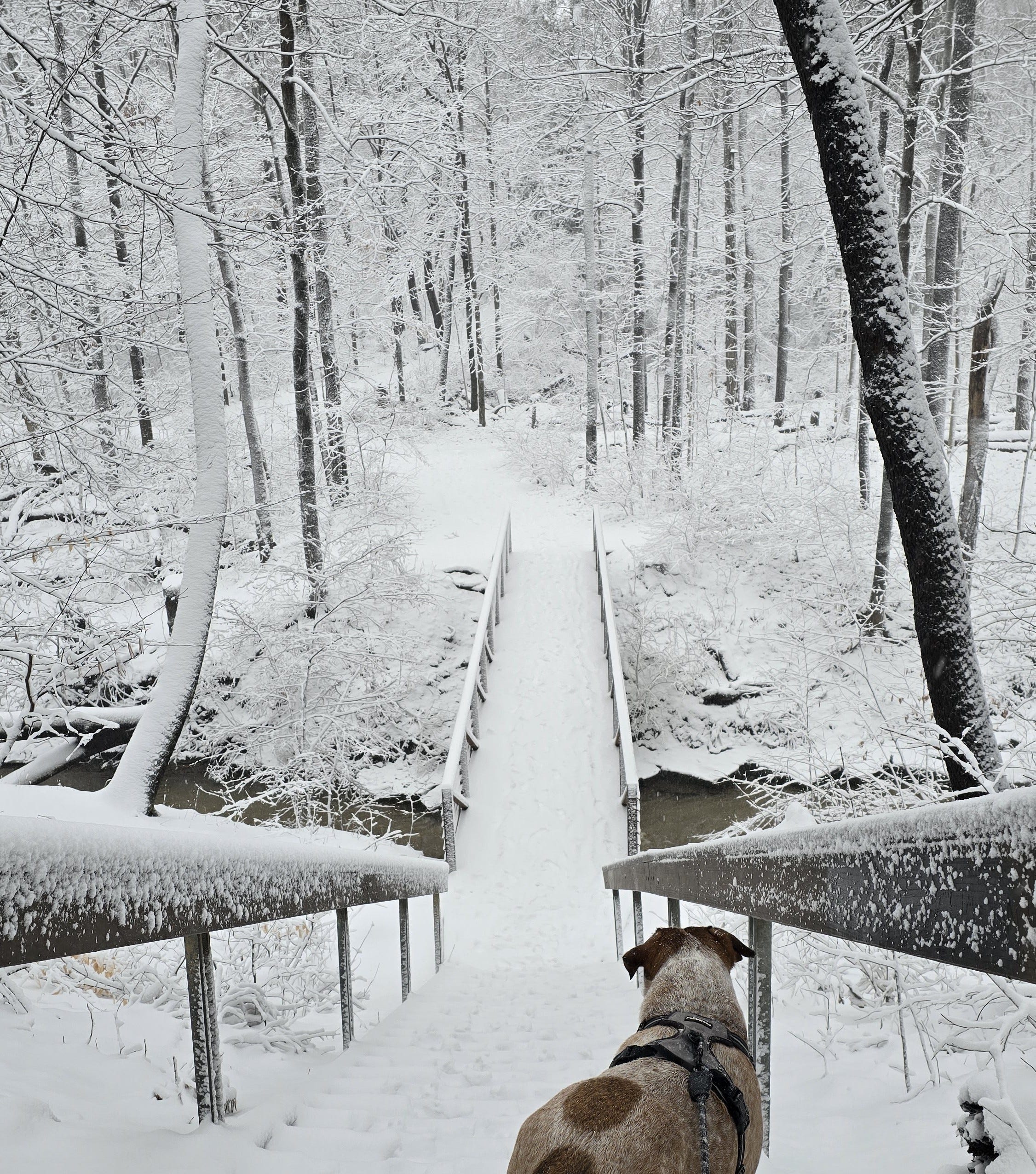 Yesterday, for a few moments, I stood with my dogs in a winter wonderland and felt held by the silence, by the snow-coated scene. My thighs began to prickle, and I felt total peace.