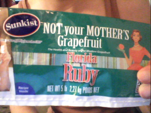 I don't know what this means!I spent the weekend cleaning my apartment, but I couldn't throw this out without sharing. It's the label thingy from a bag of grapefruit--NOT your MOTHER'S Grapefruit, as it clearly specifies. My mother isn't a housewife from the 50s (or a cartoon character, unfortunately--would have been fun, growing up with a cartoon mom) so not sure I would have made that assumption.