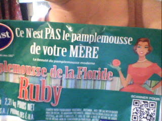 I don't know what this means!I spent the weekend cleaning my apartment, but I couldn't throw this out without sharing. It's the label thingy from a bag of grapefruit--NOT your MOTHER'S Grapefruit, as it clearly specifies. My mother isn't a housewife from the 50s (or a cartoon character, unfortunately--would have been fun, growing up with a cartoon mom) so not sure I would have made that assumption.Oh, and in case you can't see the little letters above "Florida Ruby," they spell out: The Health and Beauty of the Modern Grapefruit.