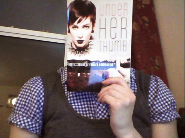 Anyway, here's a bookish selfie of "Under Her Thumb" and me in the "spank me hard" outfit I happen to be wearing for my girlfriend. (Mission accomplished, by the way. She's realized that its hurt the most when she spanks my outer thighs, so now she zeroes in on them until I'm screaming, "No! No! Nooo!" And she also somehow got me upside-down enough to slap my asshole, which I think was an accident, but holy guacamole--that smarts!)
