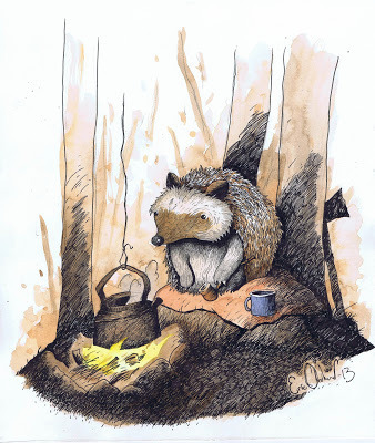 A hedgehog in the woods, smoking a pipe and brewing tea. He's using a steel enamel cup, which I love. This is one of those commissions where the patron said "do what you want" which is the best thing ever. It's a gift. You'll always get something interesting with that request, I think.
