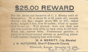 My REWARD postcard sent from Ellsworth County, Kansas, to Hot Springs, Arkansas, in 1904, identifies the fugitive as Rissley, but he was known as Charles J.… Read the rest