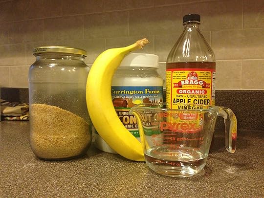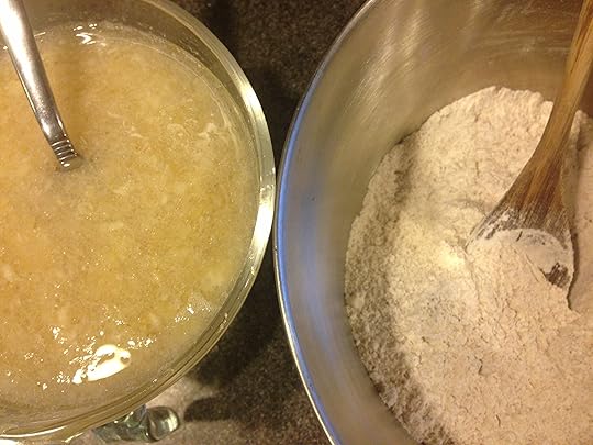 4. Combine the flax/water mixture with the oil and vinegar and the mashed banana. Slowly fold this mixture into the dry mixture. Make sure it is not too hot of it will made the dough chewy.