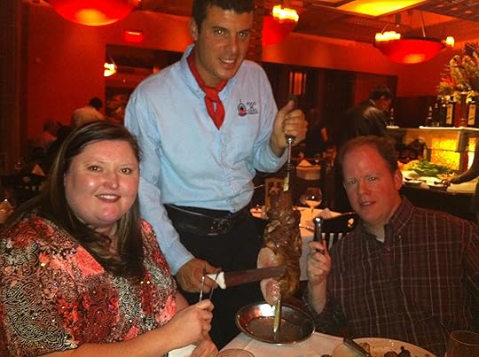 We started our Hollywood vacation on Monday the 11th by visiting the La Brea Tar Pits. I learned a few interesting things. I'd always believed that the animals wandered there and got stuck then sank into the tar. This is not the case. The tar seeps up from the ground and mixes with water, then leaves land on top and the animals can't tell it's dangerous. They go to drink and then get stuck and they die by either starvation or dehydration or by being attacked by numerous predators that often get trapped with them. There are no dinosaurs there because the tar pits developed after the dinosaurs lived. Interesting place. After that we went to the Grove which is a huge mall with a farmers market attached. I don't know how we didn't see the farmers market. We didn't find out about that part until later, but it's okay because we couldn't have brought home delicious fruits and veggies anyway. We met Raffi, the movie producer, for dinner at Fogo De Chao, a Brazilian restaurant that served a delicious assortment of fire roasted meats on skewers. The cool thing about that restaurant is that the servers bring the huge skewers to your table and slice it right there. They give diners a set of tongs so you can hold the meat while they slice. Interesting and very fun. They even give you a red light/green light sign which you can flip to signal the servers to bring more or stop.