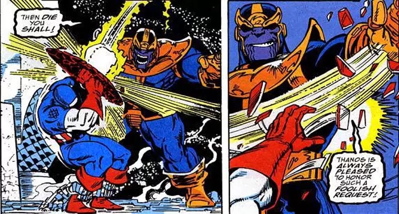 What I'm hoping they DON'T do is get the Scarlet Witch to pull a "Twilight" esque vision where the Avengers see a possible future where Ultron rules everything and they see Captain America's shield all broken. That would be cheesy. But then again, stating that something is made of a material that can't be broken only to break it to demonstrate the power of something is the cheese from which all comics are made of. The thing is...we keep buying it in buttloads. Of course, we could get Thanos to pop in and destroy the shield. He's done it before: