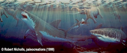 Just think about the kind of real life kaiju battle that would have been. Seriously. Spinosaurus vs. Megalodon. Other than the title of a great movie made for the SyFy channel, this battle may have actually happened at some point in history. Below is my favorite artist vision of megalodon eating elephants that have been swept away by a flood. The prehistoric Earth was an incredible place.