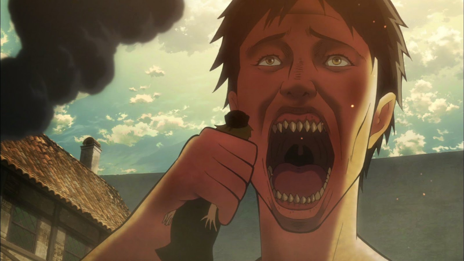 But my admiration for the show doesn't stop there. I also like the smart trappings of Attack on Titan. The warrior characters use gas-propelled jet packs to launch themselves into the air, and each has a pair of cables that can be slung into the sides of buildings like spider-man swinging his way between the skyscrapers of New York City. And the titans aren't just run of the mill giant people. There's one that is especially colossal and he doesn't have any skin. There are big ones and small ones and ones with terrifying overbites. All that chomping and chewing really does strip away the humanity from these monsters (and I say humanity because they look like giant humans). In some ways, it makes me ask this question: is this what we look like when we're eating? Good lord I hope not.