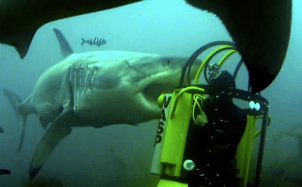 I've been glued to the screen this week because...Shark Week! I mean what else is there? Afterall it's the middle of the summer, and it's not like Game of Thrones is on television with new episodes. So with that out of the way, I want to talk about Air Jaws, and how I seriously question the sanity of the people involved. In the below excerpt, a guy named "Dickie" (yes his name really is Dickie and if he were to introduce himself to you at a bar he'd say "I'm a shark wrangler" as if that's a thing...). So in Air Jaws, our hero Dickie boards "Parthenope" which is basically a 14-foot female shark decoy that they created. Oh and they tow it behind the boat on what looks like a kite string. You've just got to watch the video to understand, but as I was watching it I was saying to myself, what's wrong with these people? The point of this exercise is to find "Colossus," a giant shark that's around 18-feet-long that they previously recorded two years ago breaching from below to eat seals. But as you view the video, please ask yourself the following question: "If this was in my job description, would I do this?" In the same episode, another of the "shark wranglers" named Fallows descends in the WASP, which stands for Water Armor Shark Protection (but honestly it looks like a flimsy cage) so that he can watch a gang of HUGE great whites. Again, why would you do this? If you watch the video, you'll see him reach his arm out of the cage and actually grab hold of a big shark's nose so he can turn it aside. It's insane.I just don't have the balls to do any of this. But I guess there's a part of me that's in awe of these guys for being so fearless. Shark wranglers are either lunatics or stupid and yet, they capture some amazing footage.