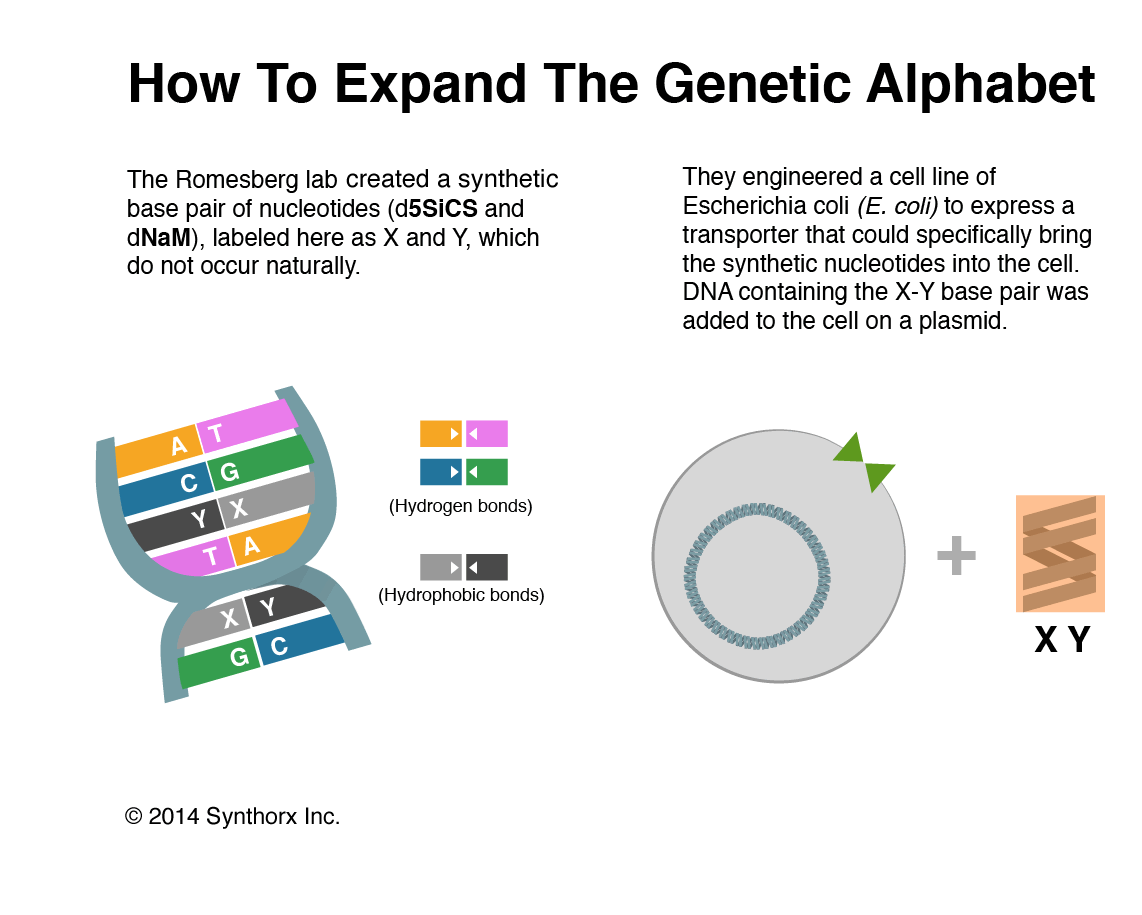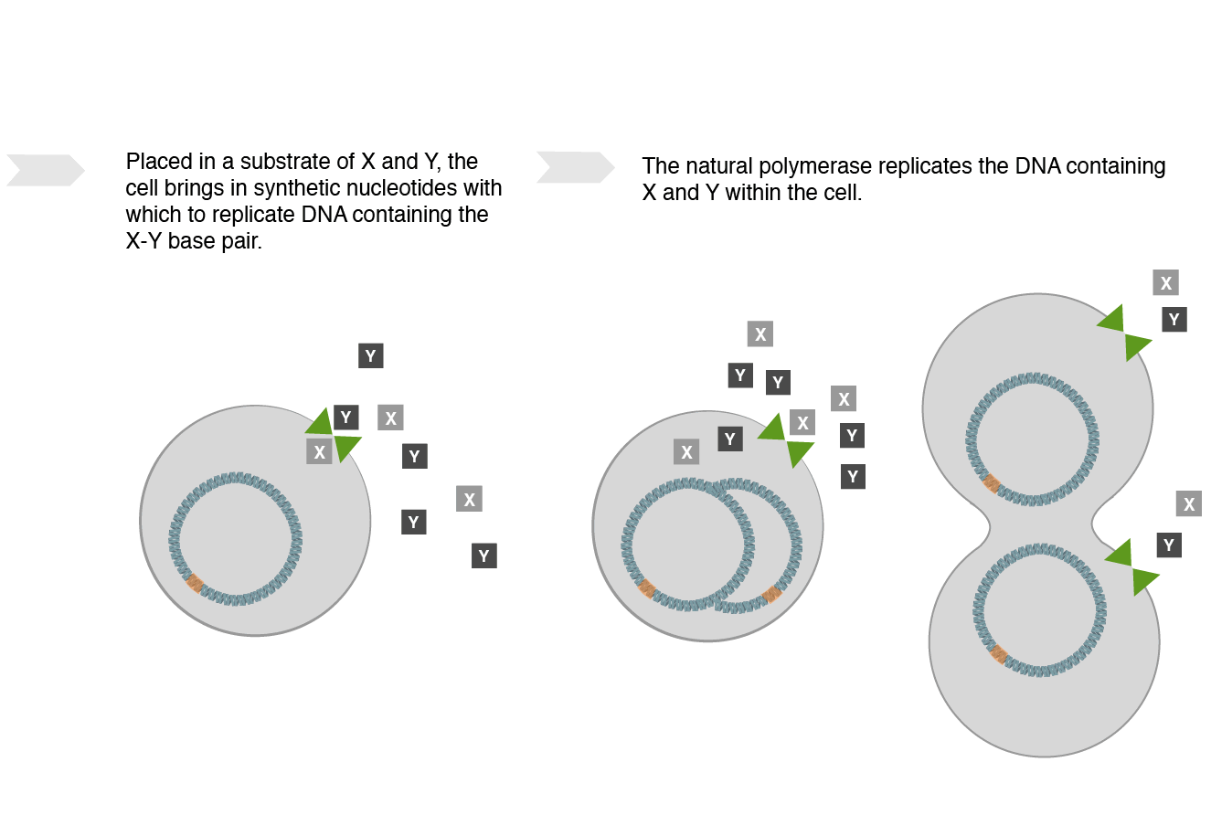"Organisms are defined by the information encoded in their genomes, and since the origin of life this information has been encoded using a two-base-pair genetic alphabet (A–T and G–C). In vitro, the alphabet has been expanded to include several unnatural base pairs (UBPs). We have developed a class of UBPs formed between nucleotides bearing hydrophobic nucleobases, exemplified by the pair formed between d5SICS and dNaM (d5SICS–dNaM), which is efficiently PCR-amplified and transcribed in vitro, and whose unique mechanism of replication has been characterized. However, expansion of an organism’s genetic alphabet presents new and unprecedented challenges: the unnatural nucleoside triphosphates must be available inside the cell; endogenous polymerases must be able to use the unnatural triphosphates to faithfully replicate DNA containing the UBP within the complex cellular milieu; and finally, the UBP must be stable in the presence of pathways that maintain the integrity of DNA."