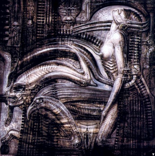 To say H.R. Giger had his demons is an understatement. The man's life was fraught with troubles. He had a girlfriend commit suicide, a well-known rivalry with friend and fellow artist Salvadore Dalí, and had a mind filled with so many horrific images that I must admit, as much as I love staring at them I would not want to spend a minute in any one were they to become a reality. I think he was as brilliant as he was disturbing, and I think the world is somehow diminished now that he's gone. And it's important when viewing his art to try and see it through the lens of his own eye: Giger wasn't painting fantasy but showing us the modern world as he saw it. Disturbing right? Take a look at this image.