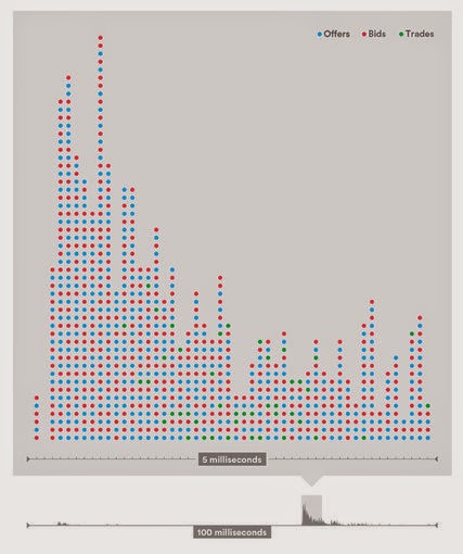 What does this mean? Well with the right algorithm (and they did have the right algorithm) a high-frequency trader could identify a big order coming in from say Pershing Square (hedge fund controlled by Bill Ackman) for scooping up a million shares of a company, buy all that available stock on the open market a micro-second before the order hit, and then turn around and resell those stocks to Pershing for more money because they were no longer available.
