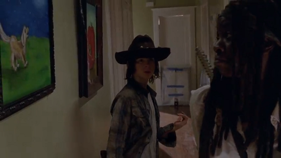 The image (posted on Reddit) suggests that Michonne and Carl were in this lady's house. Take a look at the hair, the layers of clothing, and remember the bloodbath in the nursery. There was also a picture of a dog on the wall that looks eerily similar to the dog that distracted Daryl and led to Beth's kidnapping.
