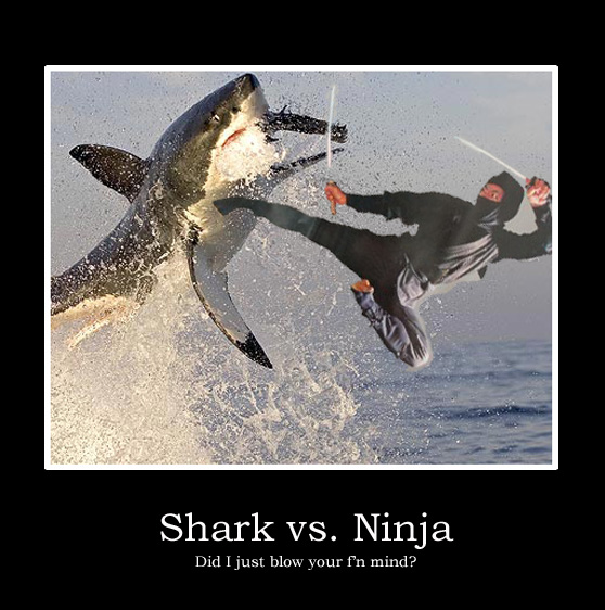 PREPARED!4) Become a ninja. Ninjas can always beat sharks. Just look at the below picture as proof. And if you cannot become a ninja, then hire a ninja. I hear they work for food. You know you've got a successful one if you tell him where you live, and when you go home, all your stuff is gone. Ninjas are like that. They can be in and out like the wind....