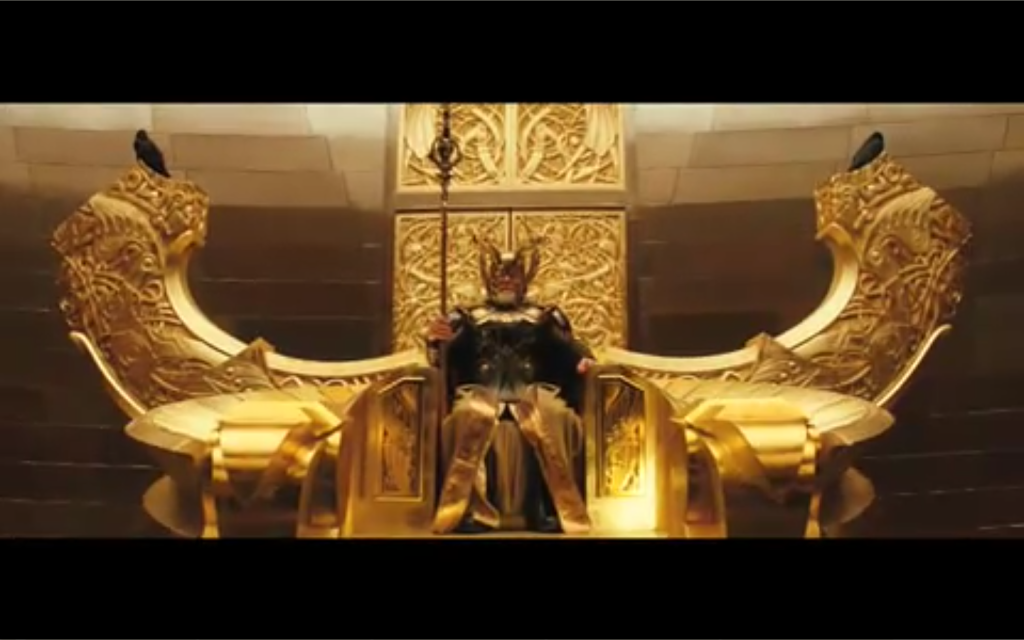 Odin in the movie Thor. Aside from the chair being way overdone, thoseravens are well-behaved. I'd a thought they'd shit all over it.