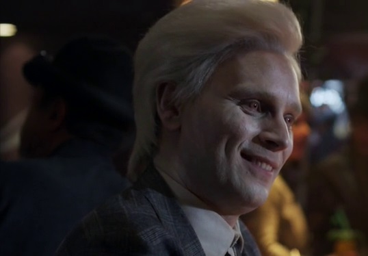 Datak on the left. Lawkeeper Nolan on the right. They don't like each other much.A little background on Datak: he's been trying to achieve a level of respect equal to his power and wealth. He knew nothing of the Bioman's nocturnal activities, i.e. kidnapping people to harvest their adrenal glands for a synthetic drug that's apparently worth a lot of money (it also kills them, but that's just "collateral damage" in the pursuit of profit, right?) Anyway, he would have helped the Mayor (Amanda) just to be a hero, however, Datak and Nolan don't get along at all, and Nolan burst down Datak's door and drags him out into the street, treating him like a common cur. It really pisses Datak off. So Datak hands Nolan and Amanda some great lines about how the town uses him all the time but never recognizes him. It's all true. And that, Datak says, is the reason he won't help Amanda find her sister. Pretty awful eh? Hold on...it gets better.
