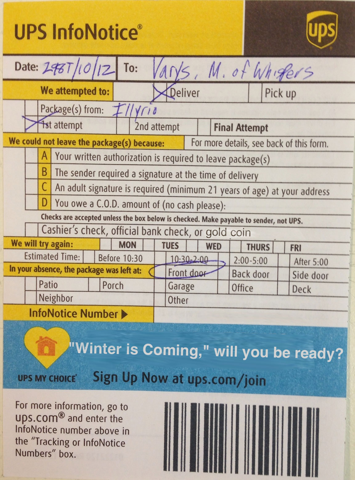 Grantland produced this awesome UPS label that shows the Master of Whisperersmissed the first delivery attempt of the sorcerer in the box seen in episode 4.In episode 5 called "Kissed by Fire" the Starks have gone completely bloodthirsty. Arya wants revenge on the Hound so much that she almost takes it herself, and Robb cuts off the head of Lord Karstark despite what all of his advisers tell him to do. The best part of this episode though was the tub scene between Jaime and Brienne where he tells her about the mad king and what happens when a ruler has gone insane. The little bits about how the king loved to watch people force fed wildfire so he could watch them burn was awesome and how the first person Jaime chose to kill was the chief pyromancer followed by the cowardly king himself. Another gem in this episode was when Loras Tyrell got laid by his squire. Sure the dude was a spy hired by Littlefinger, but holy crap, I must have watched that scene like ten times. I hope we see more of that in the future.