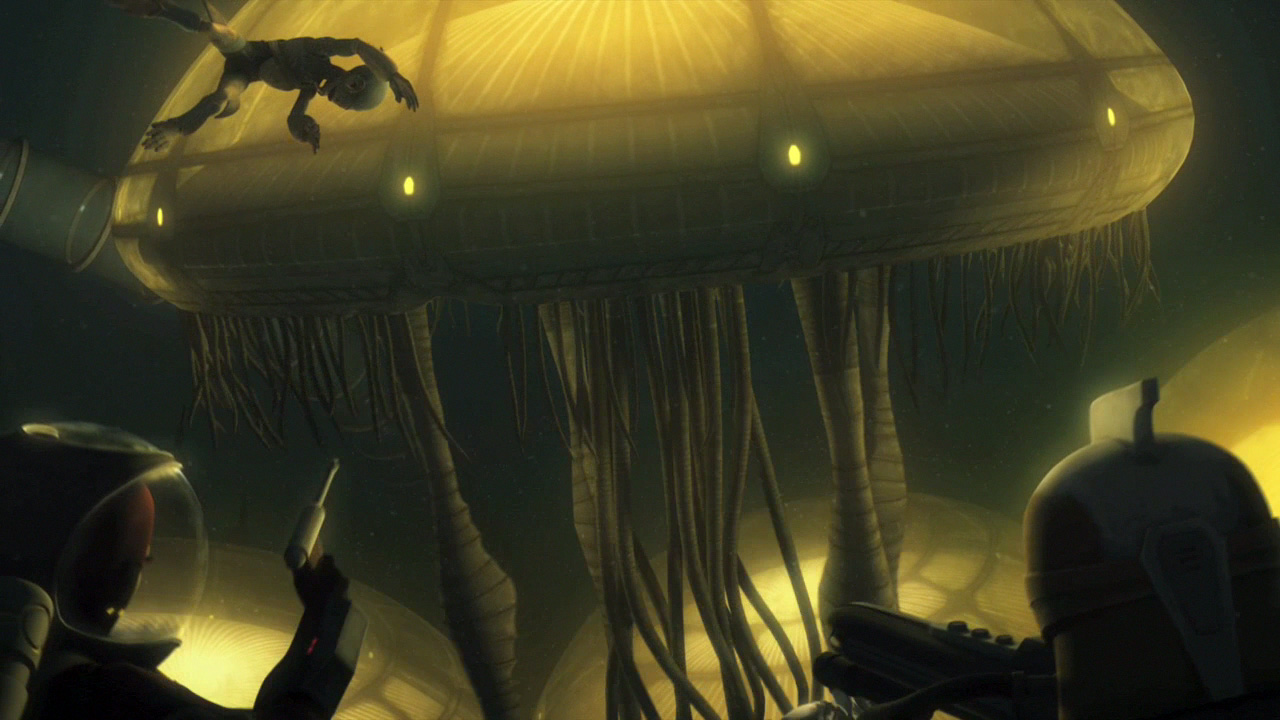 behind his shoulder. Click to Embiggen.The scope of this three episode arc is huge. The first wave of clone troopers that come to the rescue is utterly defeated. The second wave of support from Gungans arriving from Naboo also gets defeated. It's only when the Quarren realize they've been duped by Riff Tamson and rise up with the help of the Mon Calamari to take back their world, that the Separatists are finally defeated.