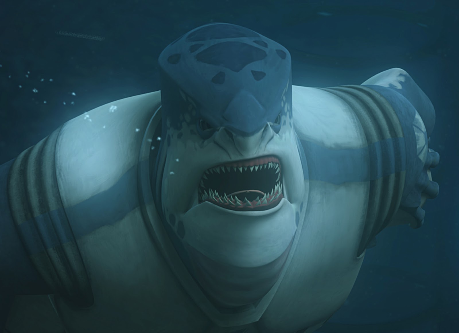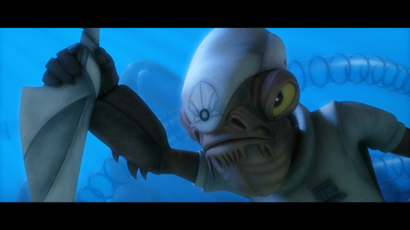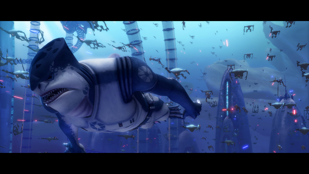 Riff Tamson. Doesn't he look awesome? Click to Embiggen.And Riff looks freakin' awesome! They've taken a great white shark and basically given it human-like qualities. He's ferocious, a fast swimmer, and you get the impression he likes to eat other races for pleasure (live bait). We're talking a "gnaw on your leg until your f'ing dead" type thing. And of course, he's a strong arm for Count Dooku who is trying to start a civil war on Mon Cal in order to weaken this world that's allied itself with the Republic.So over the course of three episodes, we get a water war. There are clone troopers in aquatic swimming gear, huge firefights, lightsaber battles, and enormous Mon Cal cities which are breathtakingly beautiful. They have glass tubes connecting the towers of the Mon Cal cities that have super fast currents flowing in them so people in the tubes can swim from one building to the next in a flash.