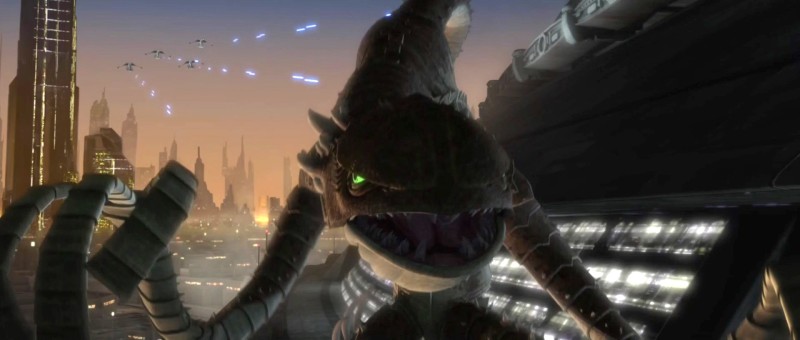 The Zillo Beast scaling huge buildings in Coruscant. Yes, those are fighterplanes shooting at him in the background. Zillo Beast is just hungry. Zillo