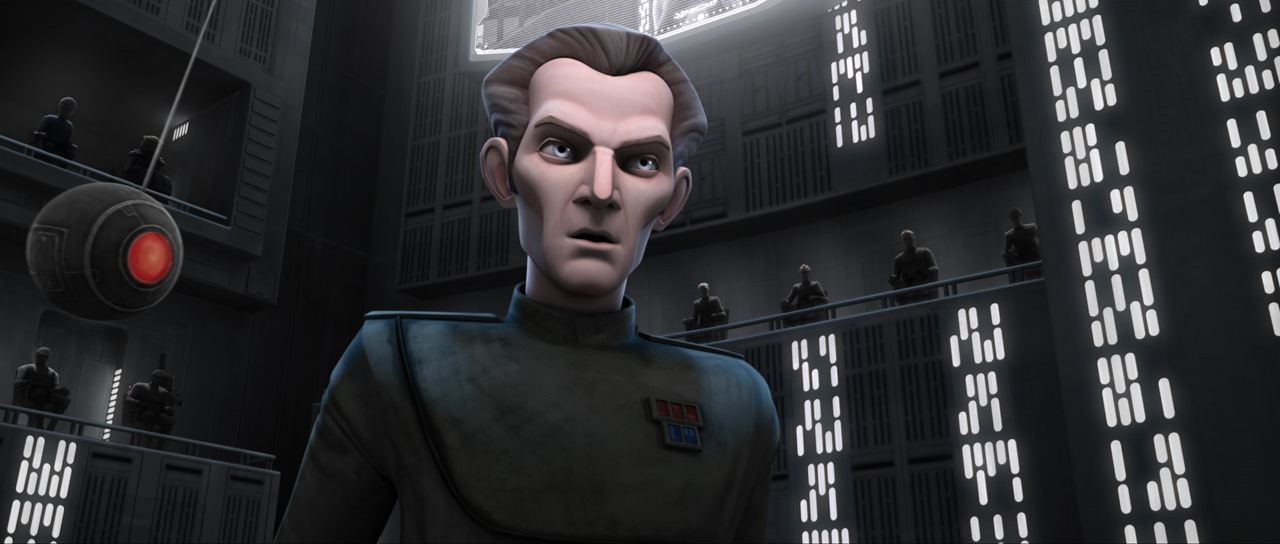 Captain Tarkin at the end of season five sentencing Ahsoka Tano forbombing the Jedi Temple. His manner, appearance, and uniform strike