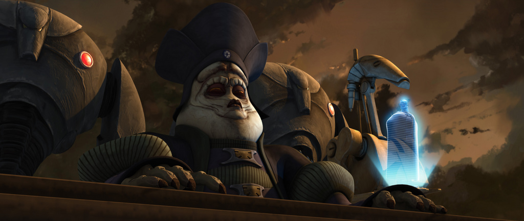General Lok Durd consulting with Count Dooku in "Defenders of Peace"I first became aware of Lok Durd in the episode "Defenders of Peace," the fourteenth episode in Season One of the Star Wars: the Clone Wars television series. Here are the words that lead into the episode:Republic forces in retreat! While rescuing General Aayla Secura from certain defeat, Anakin Skywalker has been seriously injured. After a narrow escape, our heroes crash-landed on the remote world of Maridun. Stranded, and with no way to contact the Republic, the Jedi receive medical aid from the peaceful Lurmencolonists.