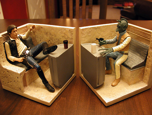 This scene in the Mos Eisley cantina is probably the biggest controversy of the films.Who shot first?In the original 1977 release of Star Wars, Greedo did not shoot at Han at all. When Lucas re-released the film in 1997, Greedo gets a badly-aimed shot at Solo before Solo kills him. Lucas said that this change is to enhance Solo's overall heroism. But it pissed a lot of fans off...people who had lived with Han Solo being this complete roguish bad-ass for twenty years. So it forced Lucas to edit it yet again in 2004 to make it so the two shots are almost simultaneous, with Greedo shooting first. Thus Han is still a "hero" because he kills Greedo now in "self-defense" to match up with the morals of an unforgiving public.