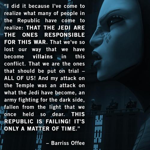 I was really surprised that Barriss Offee turned to the dark side in the last episode of the series. And I'll probably always want to know what Luminara Unduli would have to say about that. Below is the speech that Barriss gave to the Jedi Order shortly before she was sentenced for the terrorist attack on the Jedi Temple.
