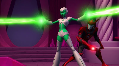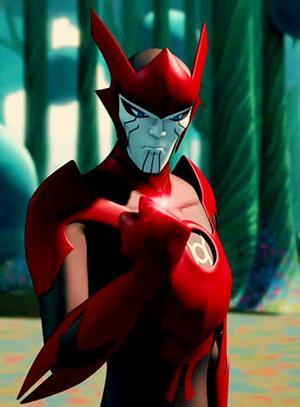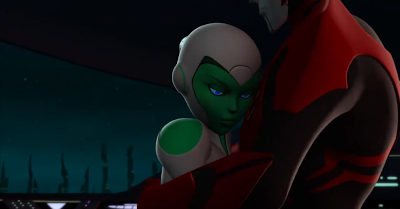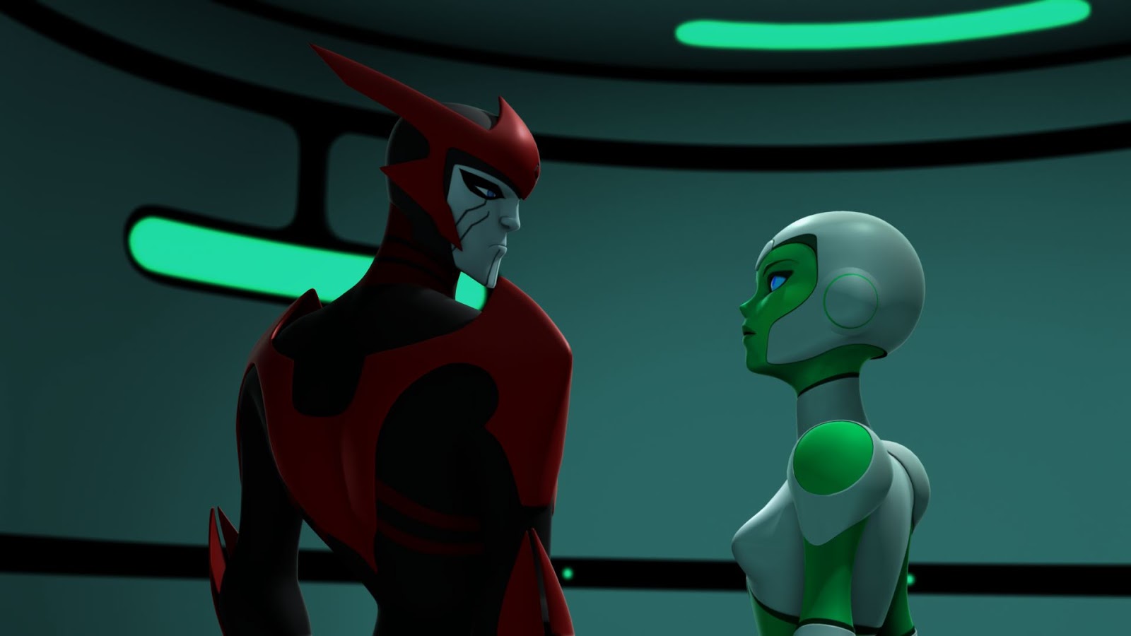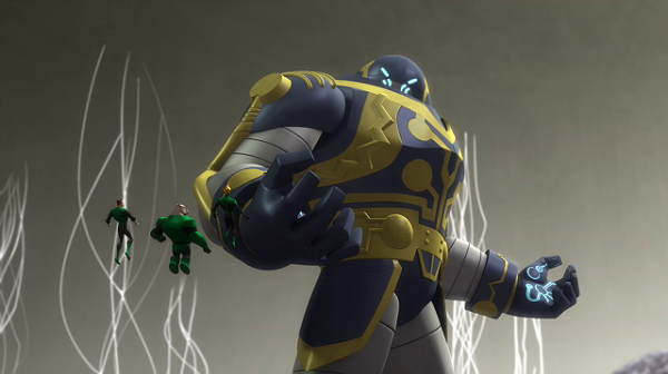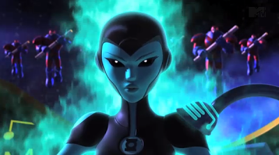 "Bow before me! For I am the Anti-Monitor!" Seriously...this guy was a badass.In the clip below, Razer turns himself into a red bullet that's fired from Kilowog's huge gun. It's completely amazeballs and I think you should watch it. Red energy defeats green energy in case you don't know...So basically, Aya goes back into time over the course of the remaining episodes all the way to the Big Bang (all of this is possible because of the Anti-Monitor's power). Only at the moment of creation, Razer tries to kill her but can't bring himself to do it and she blasts him. Razer is near death and Aya panics. She decides that she can't live in a universe without him. So she stops her nefarious plan and returns to the present time with Razer in order to save his life. It's proof that love conquers all.