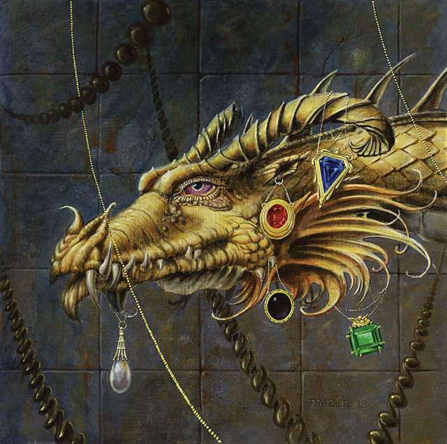 Anyway, thank you Dan Frazier for providing this awesomesauce art. That's a gold dragon hoarding all of those moxes. And the moxes (the shiny jeweled necklaces) are worth a HUGE amount of money in real life because the hoarders collectors all want them for their epeen enlargement capabilities among the nerd elite.