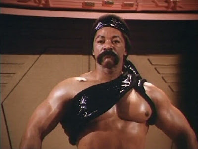 This is Pantherman, Princes Ardalla's uh...bodyguard. At one pointthe ship starts shaking, and he has to stabilize poor Ardala in her nightgown