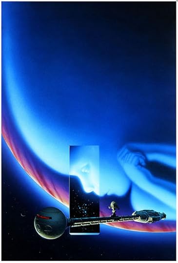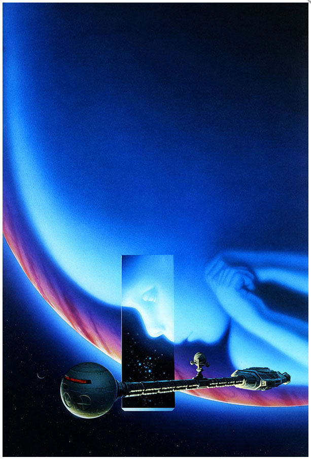 2010: A Space Odyssey courtesy of Michael Whelan. Click to EMBIGGENBy today's standards, this cover for Arthur C. Clarke's iconic 2010: A Space Odyssey is nothing special because we have PhotoShop. But in 1982 when Michael painted it, it was the thing that really made me notice the power of an acrylics air brush. I still think it's beautiful.Michael did 10 separate proofs for the publisher before selecting this one. The spaceship Discovery is positioned to kind of seem like a baby's rattle. It's more of the symbolism that Whelan always includes in his paintings. And of course, showing the baby against the backdrop of our solar system's largest planet, Jupiter, is a hint that Jupiter will become the origin of life for its own solar system when the monolith causes the gas giant to experience nuclear fusion and ignite.