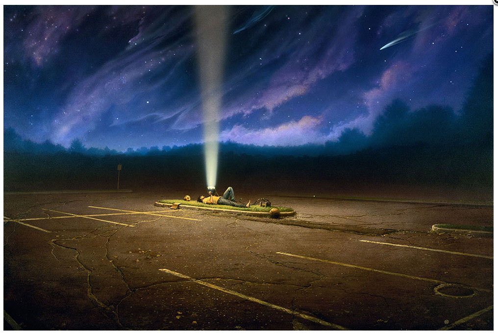 "The Astrophysicist" courtesy of Michael WhelanCLICK TO EMBIGGEN FOR DETAILOne of the things I love about Michael Whelan is that he uses his family in many of his portraits. This is his son staring at the night sky in a parking lot (he now majors in physics at a distinguished university). Everything in Michael's paintings have symbolism. The two balls are exactly ten paces apart which refers to something Neil deGrasse Tyson said about how far apart the Earth is to the moon. Michael's lifelong dream was to see a human land on Mars.