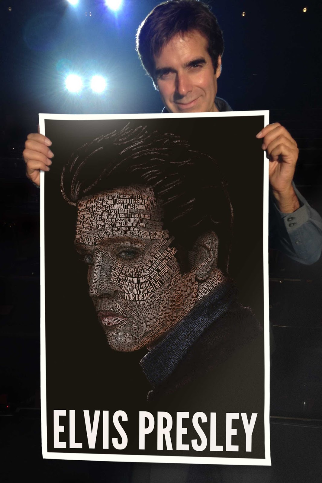 Click to Embiggen to read the wordsAt one point, he did this kind of random chain thing with the audience and told us that he'd just been to the future, and he had a poster that he wanted to show us to prove it. He picked on one person to come up to the stage and write down a dead celebrity's name (then he turned the poster around). But you can see that the poster of Elvis isn't just an ordinary poster, but one comprised of words (some of which spell the exact audience members and what happened randomly to arrive at the point of the big reveal). It was really awesome.