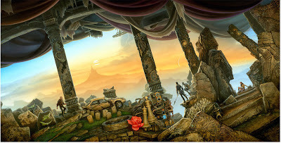 "Z-World" courtesy of Michael Whelan. CLICK TO EMBIGGENIn yesterday's post, I spoke of how Roger Zelazny died never realizing his dream of having a Whelan cover. Well he got his wish posthumously. This is the art piece that Michael got commissioned and finished for Zelazny and it has elements of all his stories (you can see Amber in the distance!). To save money, the publishing companies will have Michael do one painting and divide it up into several books. That's what they did with H.P. Lovecraft, paying Michael for only two huge paintings which I'm sure cost them probably several hundred thousand dollars a few decades ago. I remember hearing at the time that DAW books blew all of their cover budget and could barely afford the two paintings for all six books. Even back then, Michael was a big deal, and he promised DAW that he'd make some incredible pieces of art that they could then divide up to accomplish their goal.I have no idea what Michael charges now, but it's probably ten years of my current salary. If St. Martins can afford to pay Amanda Hocking $2 million to write some mermaid books, then to get someone like Whelan to do a cover is probably going to cost equally as much if not more. My guess is probably a couple million, minimum, per painting. Especially since he can just shrug and say, "I don't need you...I have as much money as I'll ever need to take care of my family and send my kids to school, etc." That's what I meant yesterday by the phrase "F U Money." It's a term I coined with my friend James to describe a turning point in a person's career where you choose your own destiny and could care less about outside forces (like the need to eat and have a place to sleep).