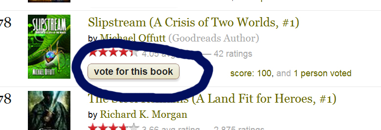 mission, if you choose to accept it...So the social networking site for book lovers called Goodreads has these lists for books (you may have seen them if you are on that site), and I'm tired of "Slipstream" being mediocre in all of them. Just in one, I would like to be higher, maybe even number one. So I picked out one that I think isn't going to step on any of my fellow author's toes (at least the ones with whom I regularly network).