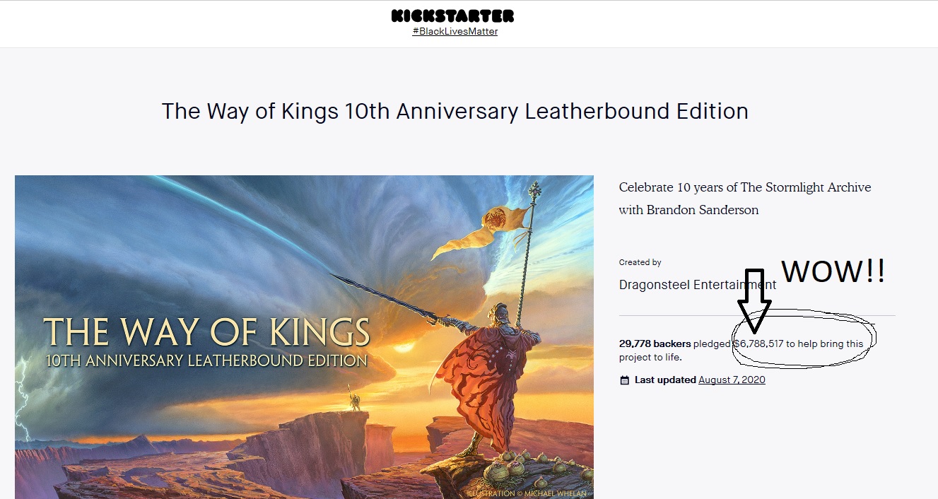 Brandon Sanderson through his company Dragonsteel Entertainment just finished a Kickstarter for a ten-year old book that nearly hit $7 million. Let me reiterate that...this book has been out for ten fricken years...available in hardback and paperback and audiobook, etc. from the big publisher known as Tor. It's as common as dirt to find online and despite ALL OF THAT, it is making MILLIONS OF DOLLARS. And I assume (now) that the rights have probably gone back to Mr. Sanderson for him to do with as he please. The book? The Way of Kings. Anyway, if they haven't gone back to him, maybe there's some kind of catch whereas he's allowed to just sell copies of vanity special editions, or something like that, and keep all the profit. Maybe the publisher was like...eh...there's no money in the vanity stroking business of leatherbound, beautiful, illustrated editions. That's a fools game! If that's what they thought, they are looking pretty silly right about now.Sure...there's going to be overhead with Sanderson's company Dragonsteel Entertainment. Maybe a few hundred thousand in overhead. Possibly the cost of a middle class home in Salt Lake City ($500,000) in overhead (which is chump change to a lot of the ritzy crowd that calls this place home). But definitely not $7 million. This Kickstarter goldmine was unbelievable. Kudos to Brandon who should be laughing all the way to the bank. I mean...damn.