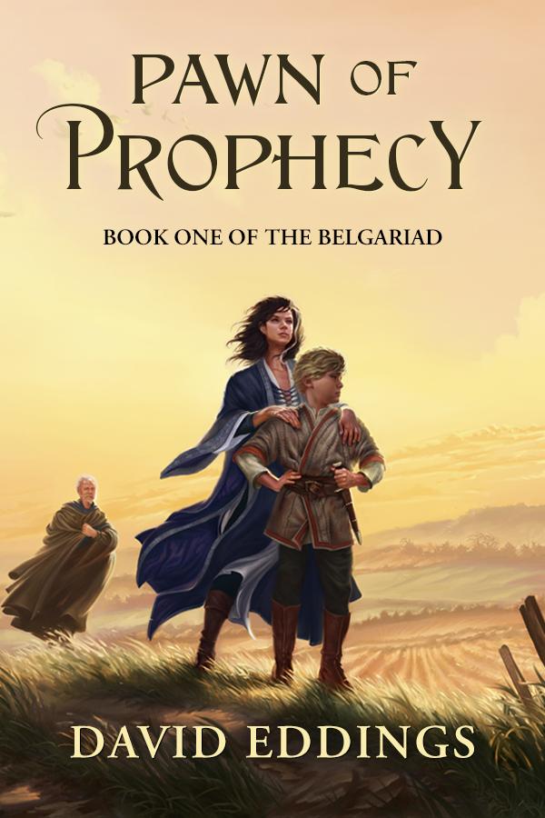 m like that. I'm on board with the drawing of Polgara and Belgarath in the back. I just wish there was more to this picture than three people standing on a farm that's clearly in Sendaria. Another thing this cover smacks of? Magic: the Gathering. It reminds me of artwork I see on Magic cards. I guess I was expecting Michael Whelan, and I didn't get that. I wanted to feel something epic from the painting.At right is another cover from the UK edition of Pawn of Prophecy that was put out many years ago. You can see what I'm talking about, with the cartoon writing of the words "The Belgariad" and the cartoony sword. So yeah...it looks like Grim Oak Press is going to continue this trend. Ah well. Who am I to question the categorization of why something is clearly written for children and another thing is clearly not? I'm nobody, that's who.