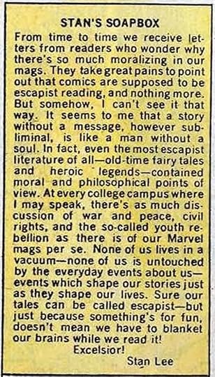 I hear all the time from white religious people in Utah about how they wish television, movies, comic books, and other forms of entertainment (they enjoy) didn't include things like feminism and other social justice warrior issues. I look to none other than the late Stan Lee for an explanation of why entertainers should never completely cater to the escapism crowd who (in their hearts) just wants to ignore the fact that our government is putting brown people in camps. This was such a refreshing find to stumble across on the internet: