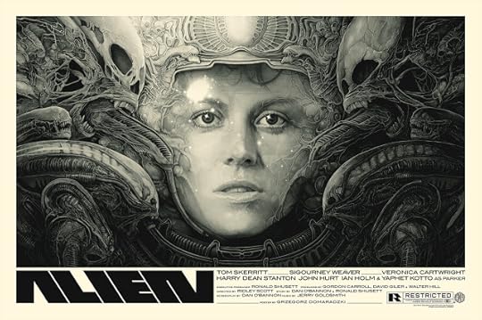 What do I love about it? The details are great. Not only is the centerpiece instantly recognizable as belonging to Sigourney Weaver, but the font looks like an actual print job. The details of the xenomorphs on both sides of her face are clearly an homage to Giger in that they are rendered perfectly, just as he would have done with his famous airbrush. And there are swirls within swirls. Good Alien art has always been heavy on the details. That was a thing that Giger prided himself on: detailing even the smallest corner of a massive painting so that there were objects that caught the eye that were interesting and macabre. The only thing really missing from this piece is Jones the cat.