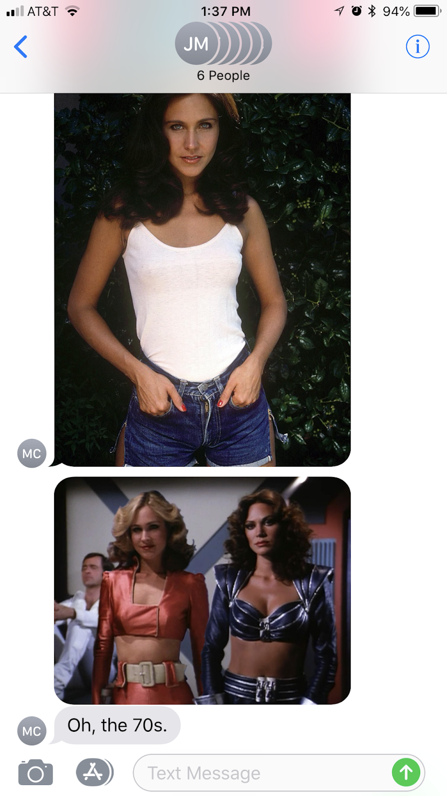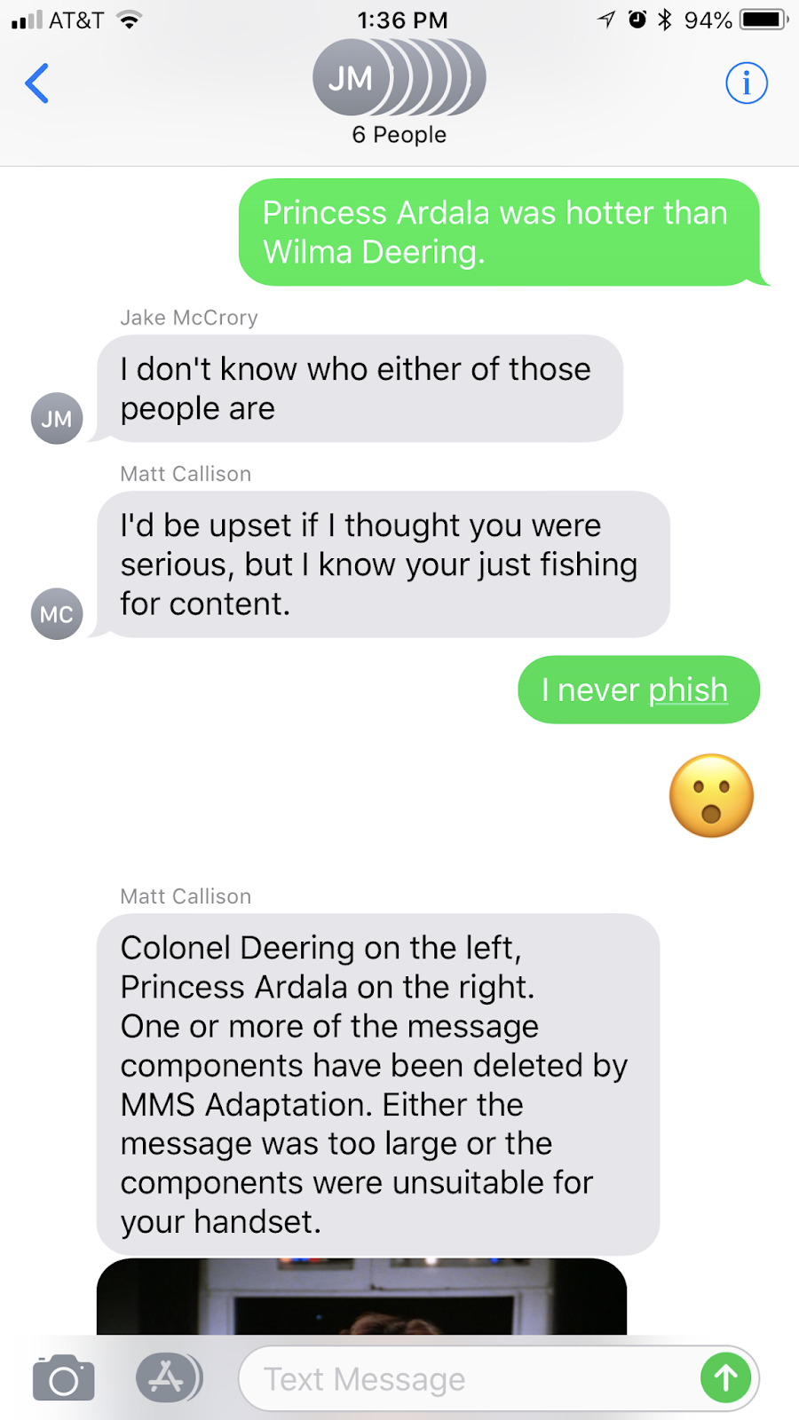 And below is an argument I started on another day. This one was mostly aimed at Matt Callison, a friend who is my age in our D&D group (the rest are younger and one is even a teenager), and who has his finger squarely on the pulse of pop-culture. The initial "insult" in green (mine) was totally aimed at trolling Matt. And I was pleased that it worked. Just to give context...there was no lead up to this...no discussion of the very old t.v. show "Buck Rogers in the 25th century." Essentially, if you hadn't lived through it, you'd have no idea what I was talking about (which was the complete point of the whole exercise to begin with).