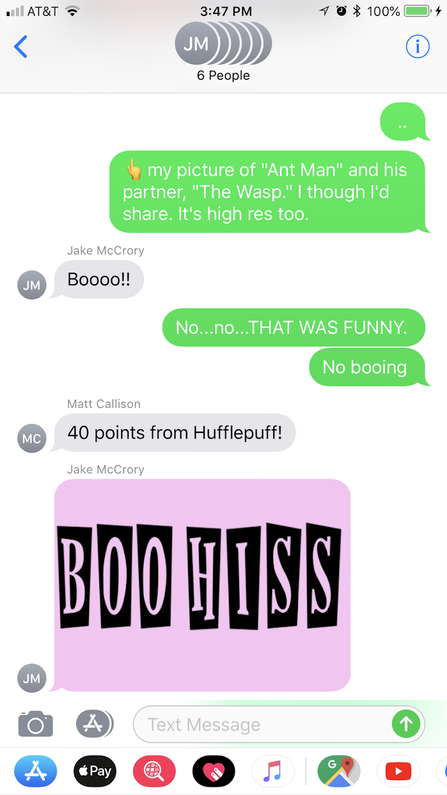 8) I dropped two jokes to the teenagers and mom that I went to the show with (oh and friend Brad was also there). I'll share them with you here. 1) Does Ant-Man actually pay the ants that work for him or are they unpaid "ant-terns?" 2) Ant-Man and the Wasp is the ant-ecedent to Avengers: Infinity War. And yes, I came up with both of these jokes.