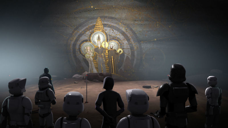 The sledgehammering of the Star Wars universe took place in the Jedi Temple that had an entrance picturing the "Mortis gods" from an episode in The Clone Wars. This was a very interesting (old) episode, for the father (pictured in the middle) had two children: one represented the Dark Side of the Force and the other represented the Light Side of the Force. The father was essentially the balance between the Light Side and the Dark Side. The three of them were very powerful.Anyway, once inside the temple, Ezra used the power in the temple and his own abilities through the Force to save Ahsoka Tano from Darth Vader (who I had presumed was dead two seasons ago in a spectacular battle on Malachor, where a Sith holocron was located). So he used time travel to actually save a major character who is now alive in the universe because Ezra chose to save her. Just think about that a moment. Time travel has now been introduced into the canon of Star Wars, and it is not just an observation kind of time travel. It is a kind of time travel that can undo literally anything.