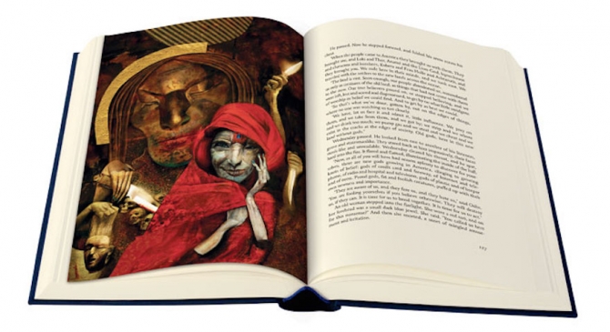 My copy of "American Gods" has some fantastic illustrations (shown above)I recently spent some extra money acquiring some gorgeous hard-bound books with fancy covers and illustrations. One of them was a copy of Neil Gaiman's American Gods, which I reviewed in this post HERE some time ago. Back in 2011, I read it as an ebook. And you know...showing someone a book on an electronic reader is just not the same as having a physical copy. I love the idea of pulling a book down from a shelf and turning pages and showing someone this beautiful novel. The reason I purchased so many ebooks over the years was that I always needed to move to a new apartment, and I didn't want to haul around a bunch of weight or go to the trouble of finding a place to put all that stuff. It was just better to forego all that inconvenience for one tidy electronic file.But now that I own a house, I look back on those decisions with a bit of regret. I think we've all gotten away from something in just about everything we do. The "It doesn't matter what it looks like, I just want the content," has a purpose I suppose, but a life with things that has no "frills" makes me feel empty. And as I talk with more and more people, I think there's a pervasive emptiness in our American culture that people are all aware of, yet no one can seem to put their finger on it. That is...I run into a lot of people that feel empty of something every day.