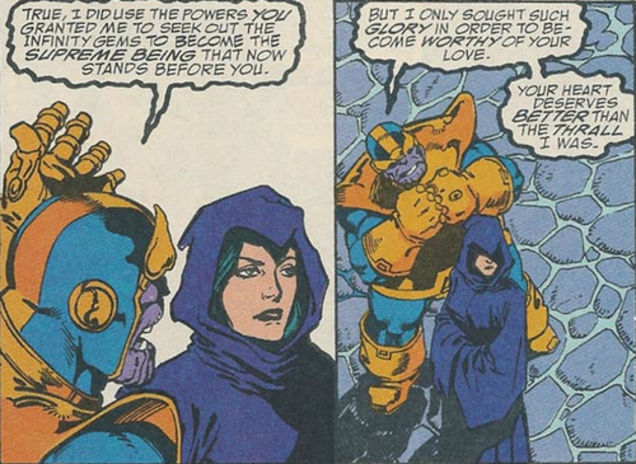 When I think about the ultimate villain, Thanos, I also realize that (despite the copious quantities of action) the build-up of every single character thread ends with a powerful love story: that between Thanos and Lady Death (whom we have not seen). Here's a panel from the comic that explains what I'm talking about: