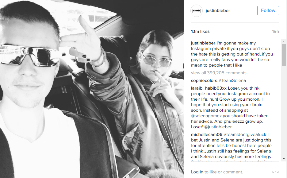 1) Justin Bieber is threatening to make his instagram private if fans don't stop bullying his new girlfriend. I mean, he's a white male that's young and has low body fat. That's really all you need to send tween girls the world round into a frenzy, right? So stop it y'all. As M.C. Hammer once said, "Can't touch this." Bieber doesn't want you to touch "this," and he certainly wants you to lay off the new lady, Sofia Richie. I'm sure this won't stop any of you who are committed to seeing more Bieber penis shots.
