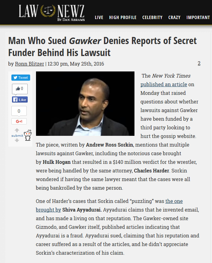 One of the websites that I sometimes read is called Gawker. Its journalism is frequently entertaining, informative, and caustic to public figures. One of the reasons that I like their brand of journalism is because the site doesn't go out of its way to present public figures as anything but human (or inhuman) with all their flaws exposed by the opinion of the writers (who tend to see the world as I see it). If a person's a giant douche, they basically call them a douche and explain why.Gawker doesn't concern itself with preserving reputations, buying into the glamour of celebrity status, or for that matter...posting very unflattering things about people. I guess I like it because there's too much fakery in the world, with people posting their narcissistic photos on Facebook and trying to put on that their lives are "oh so perfect" while yours is (in fact) a mess. So I'm a "little saddened" that Gawker is facing an existential threat in the form of lawsuits funded by a butt-hurt and angry billionaire in Silicon Valley by the name of Peter Thiel. The most public of these is the one brought against Gawker by Hulk Hogan that has cost the website millions of dollars in legal fees and got Hulk Hogan a judgement against Gawker to the tune of $140 million.